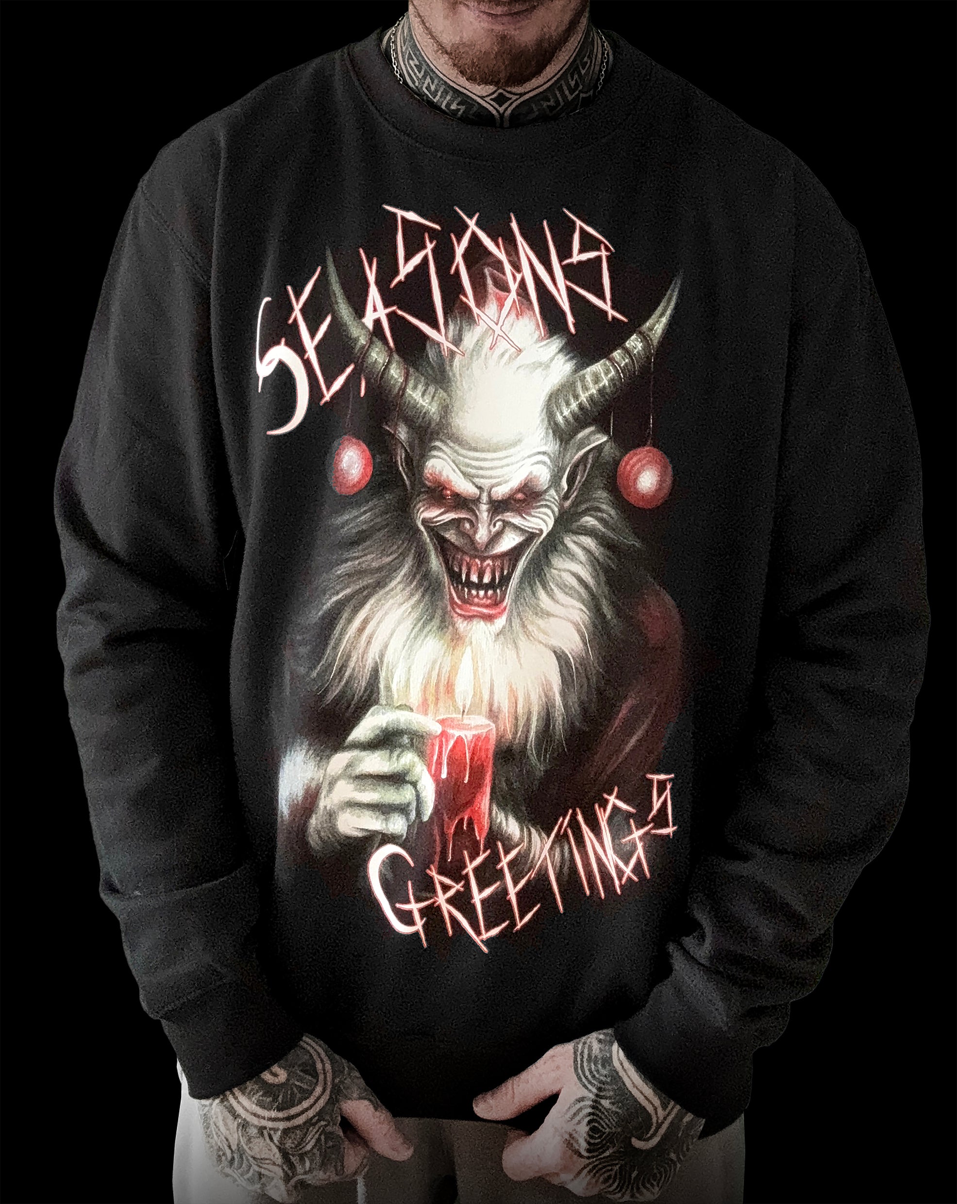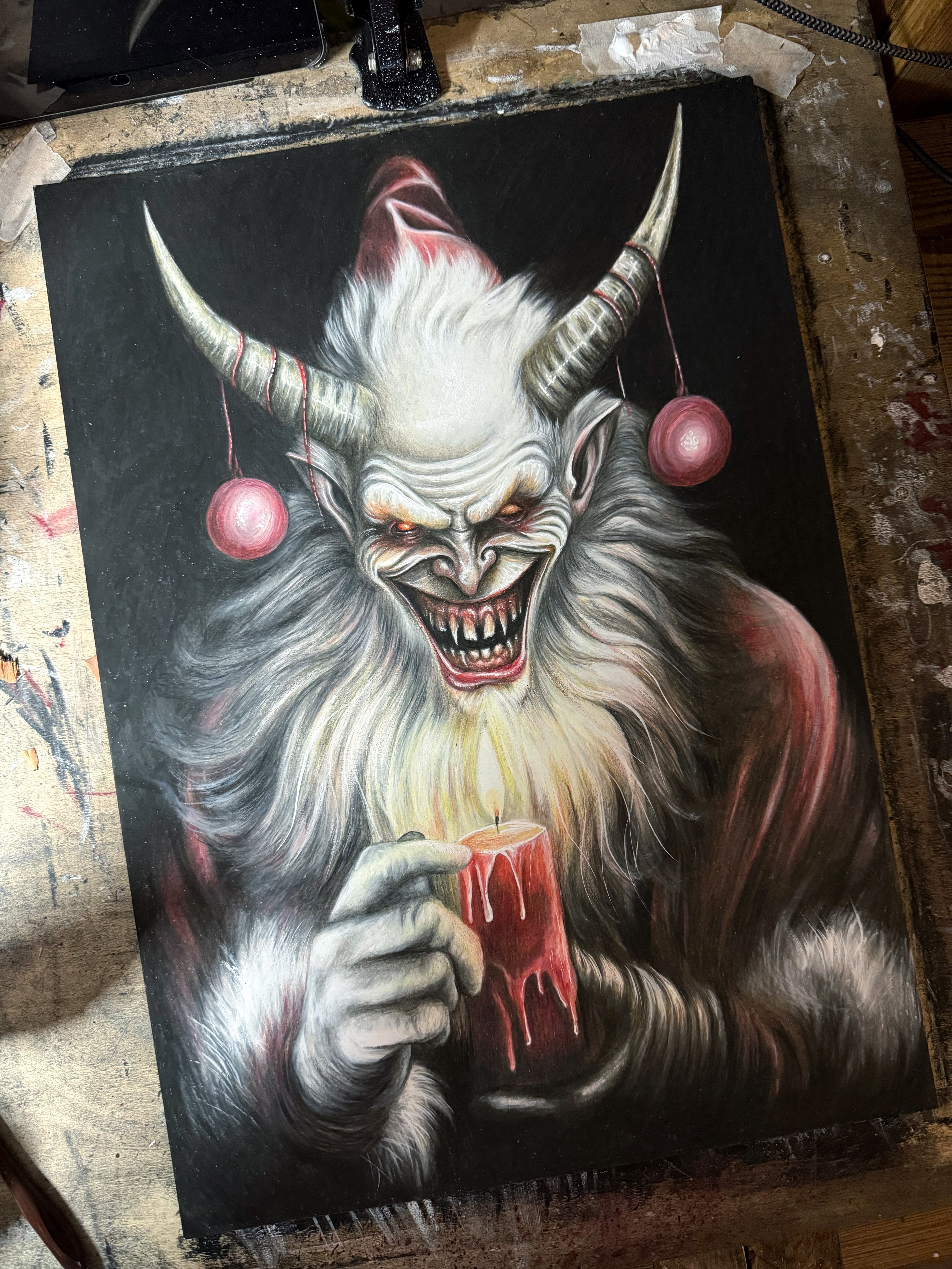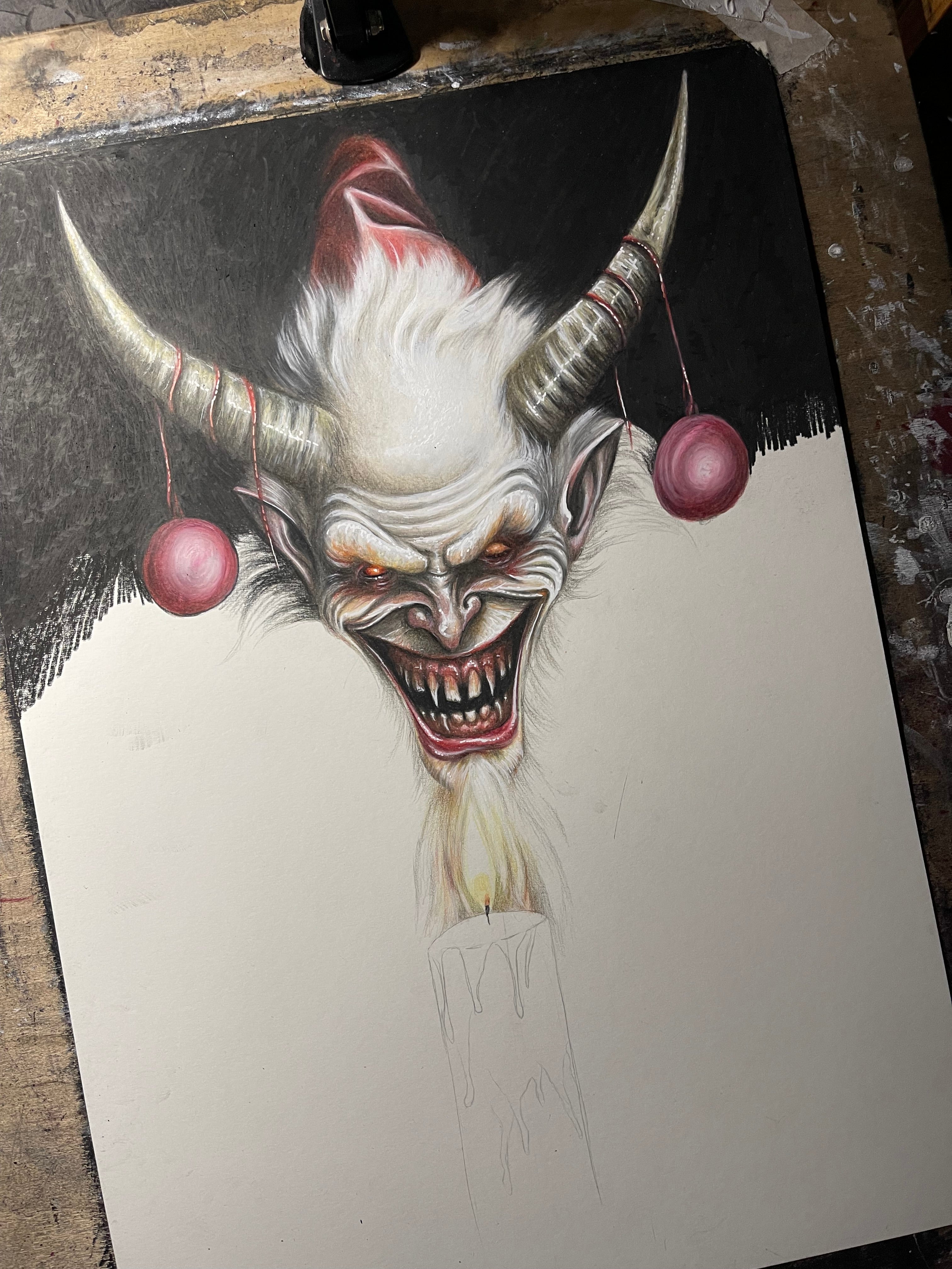 Demon Santa Design, inspired by the legend of Krampus. Original drawing was produced with Wax Based Coloured Pencil, Gouache and Carbon on Heavyweight Smooth 230gsm Paper.