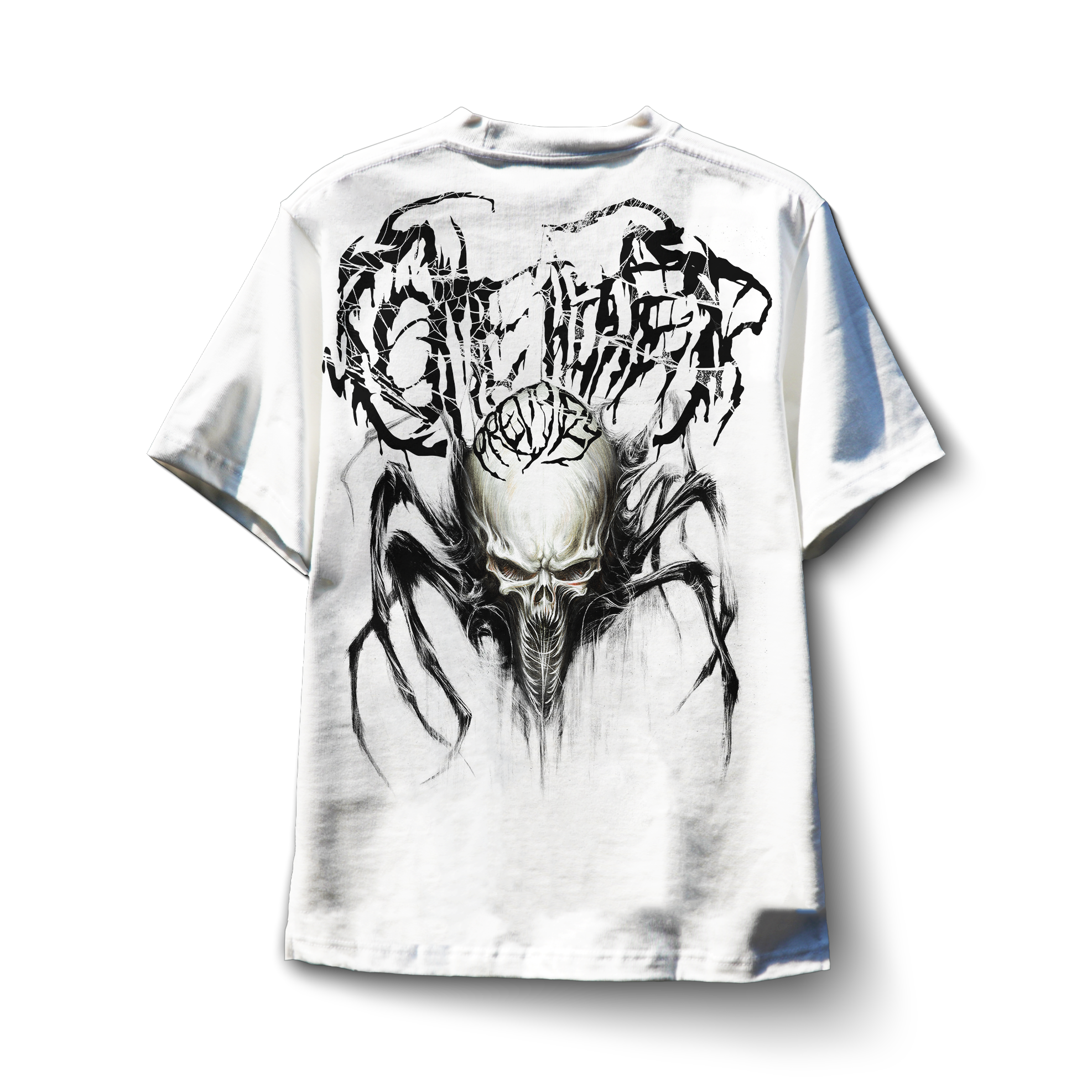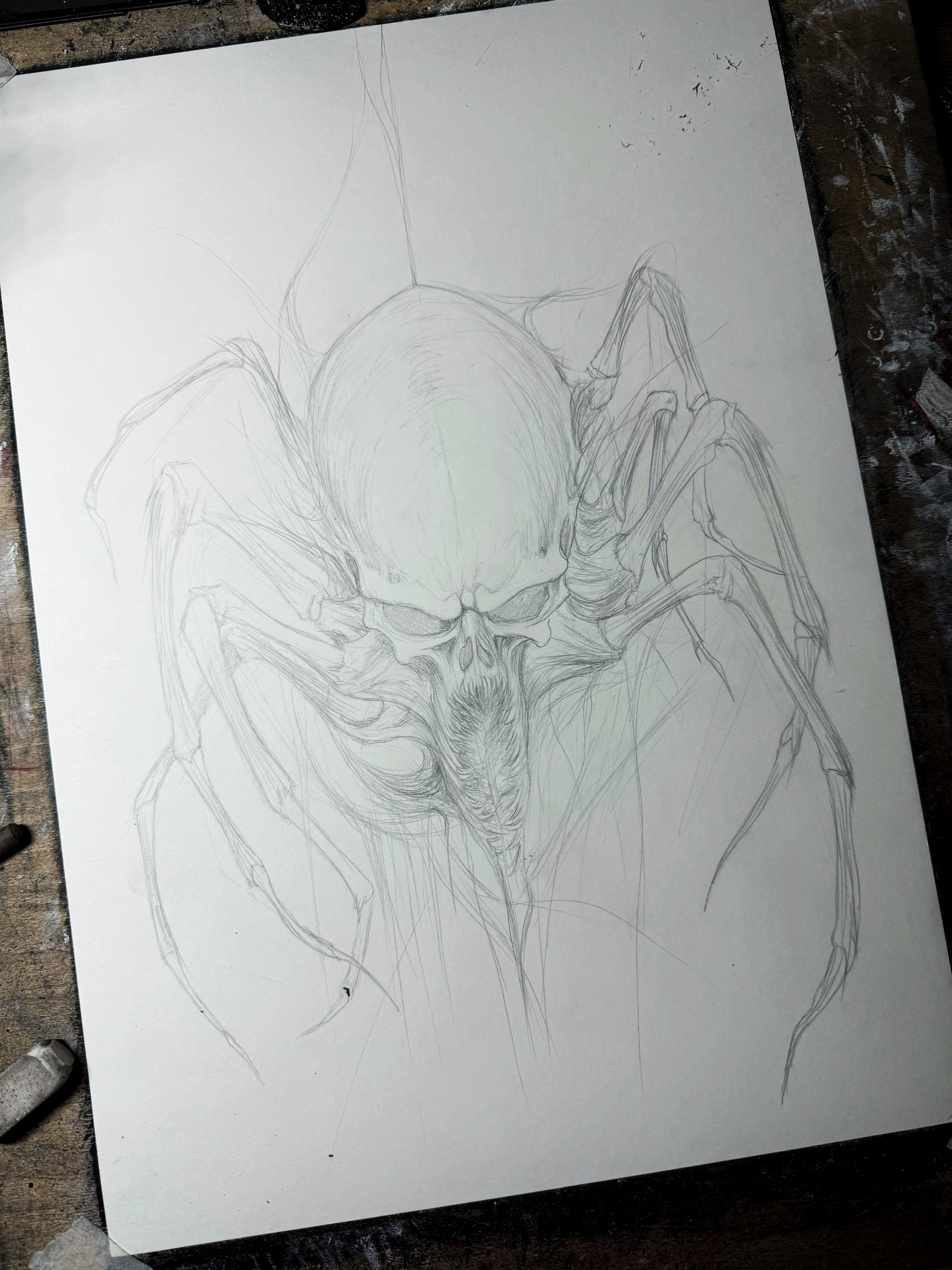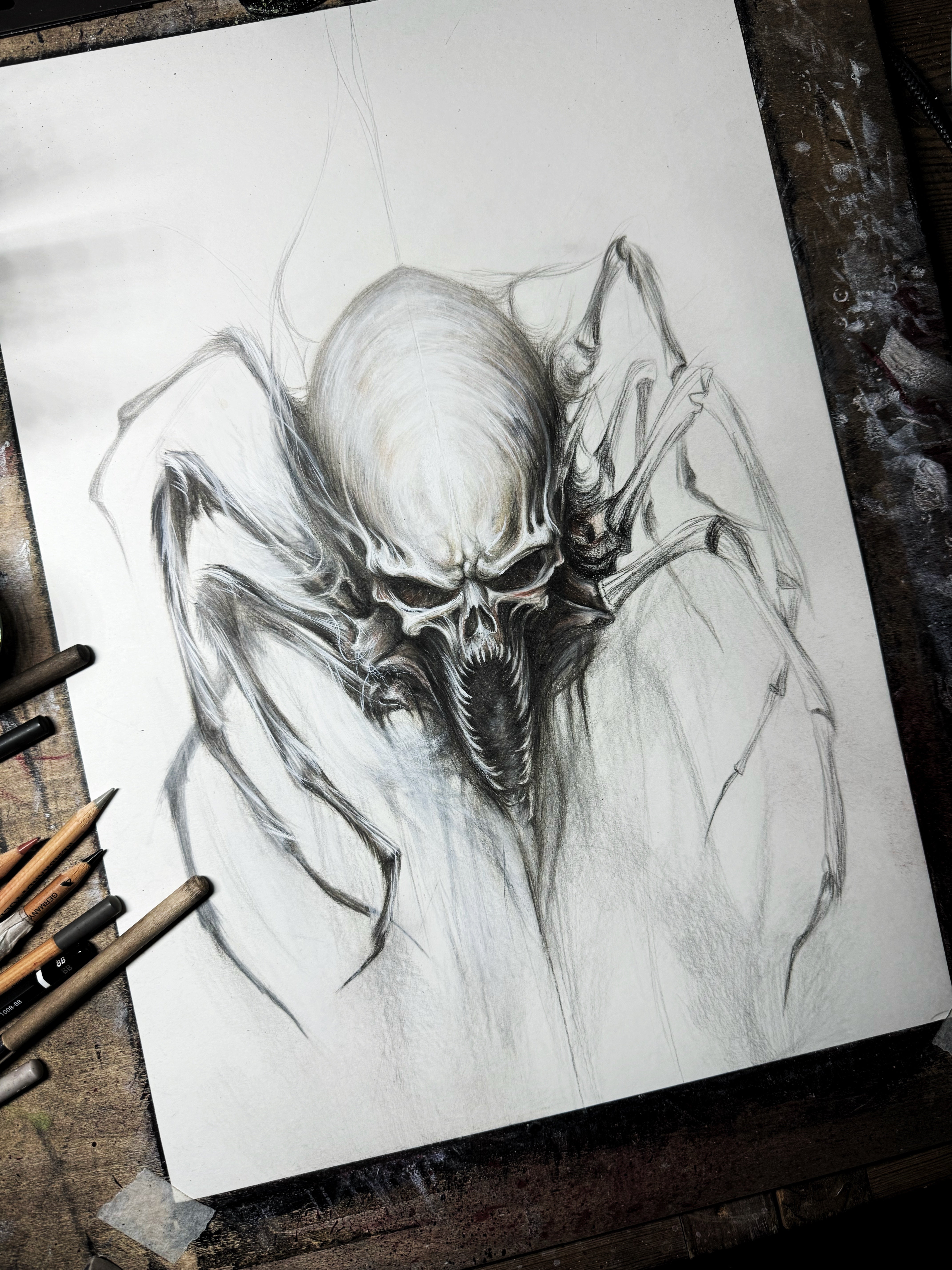 Skull Spider design inspired by the Mary Howitt poem, 'The Spider and the Fly.' Original drawing was produced with Wax Based Coloured Pencil, Gouache and Carbon on Heavyweight Smooth 230gsm Paper.