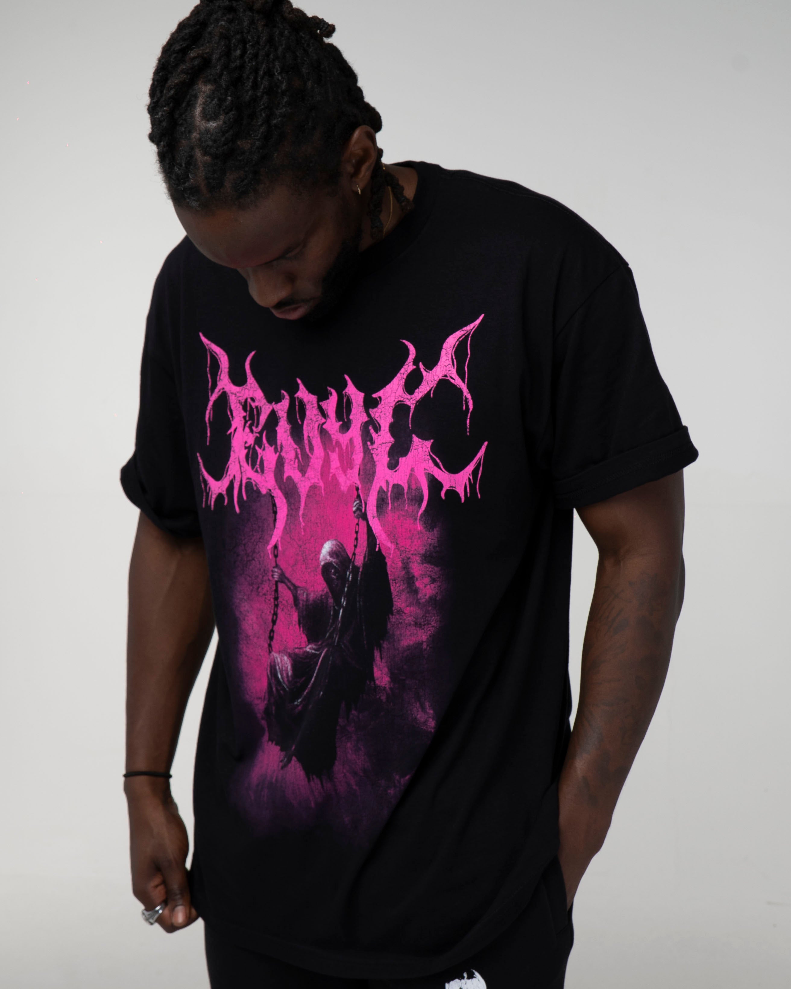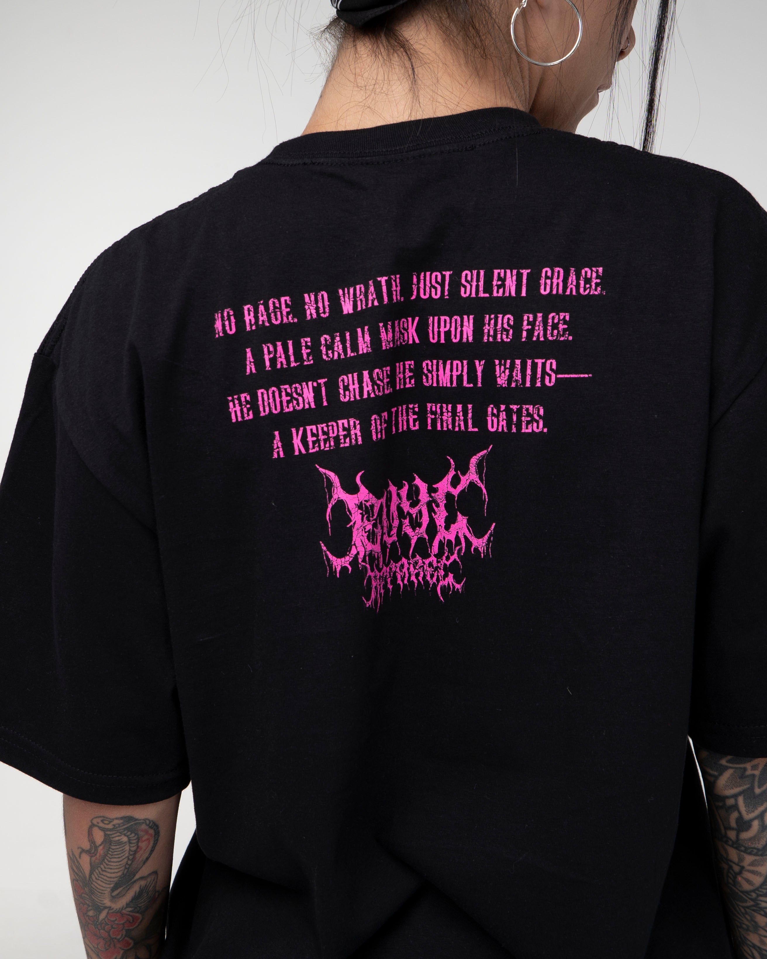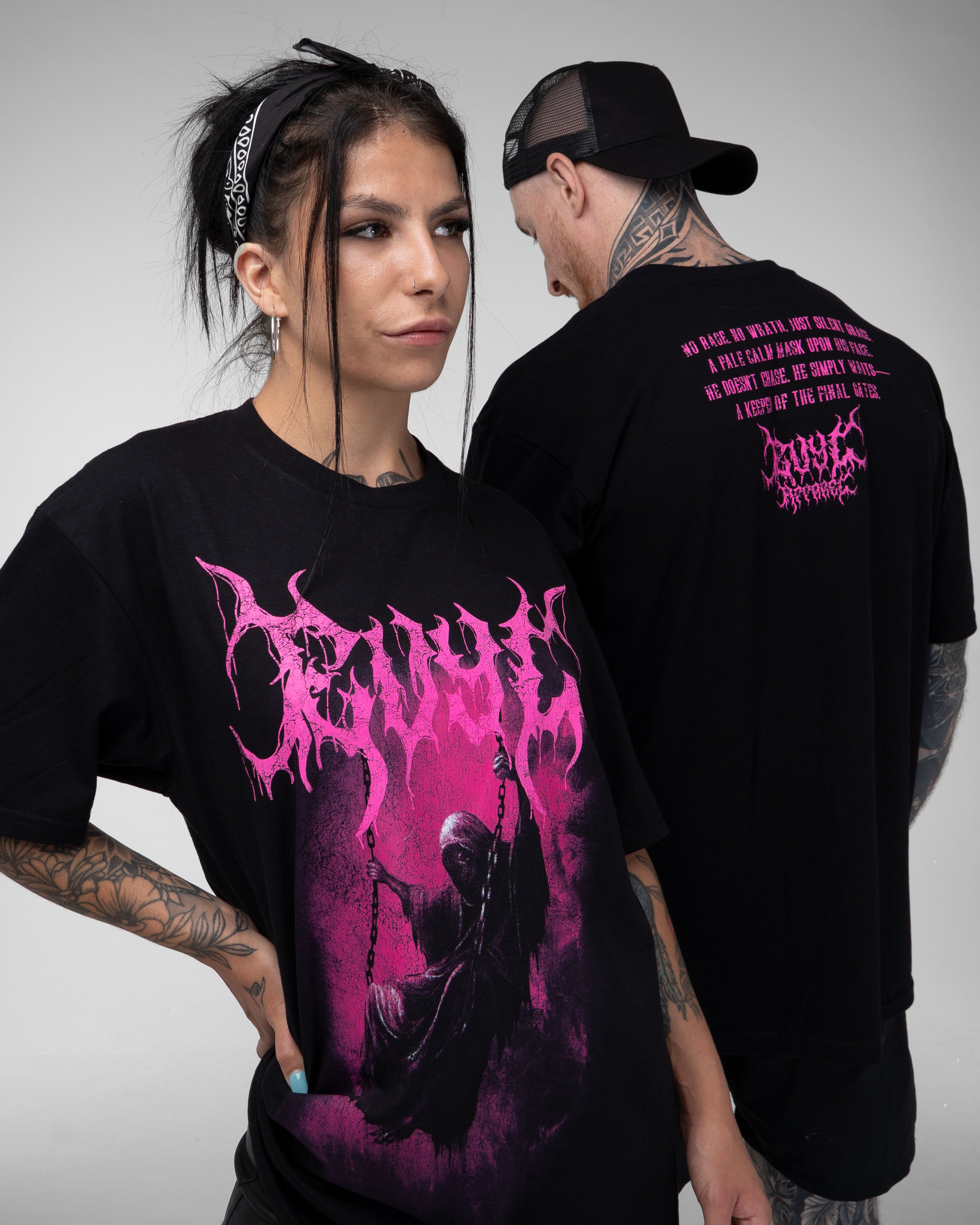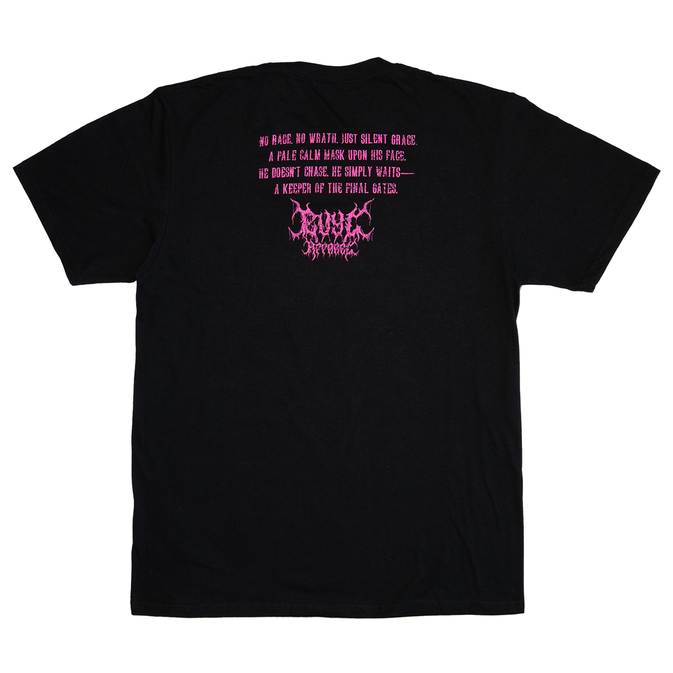 Grimreaper design, full detail as a 5 colour front print. Original drawing was produced with Wax Based Coloured Pencil, Gouache and Carbon on Heavyweight Smooth 230gsm Paper.