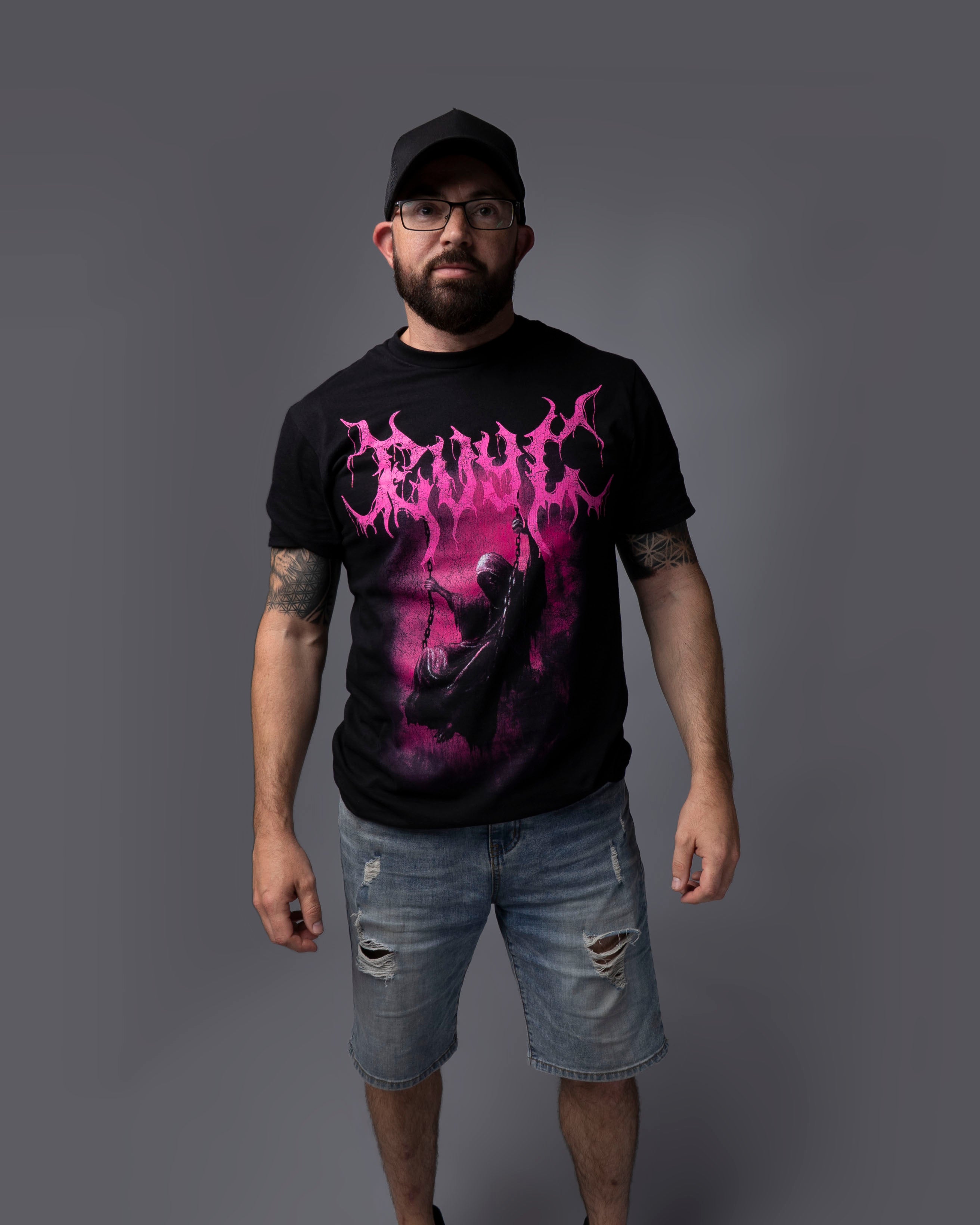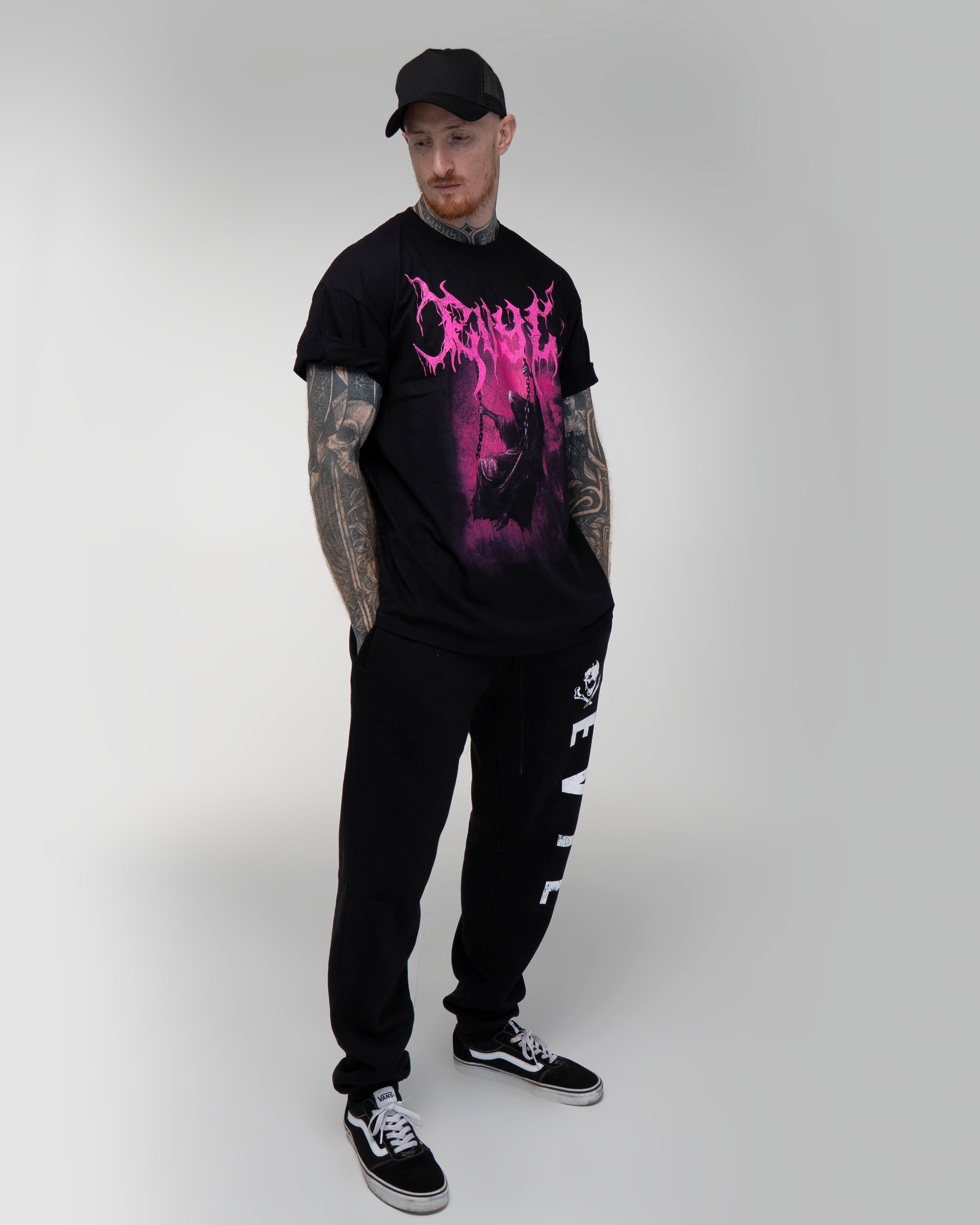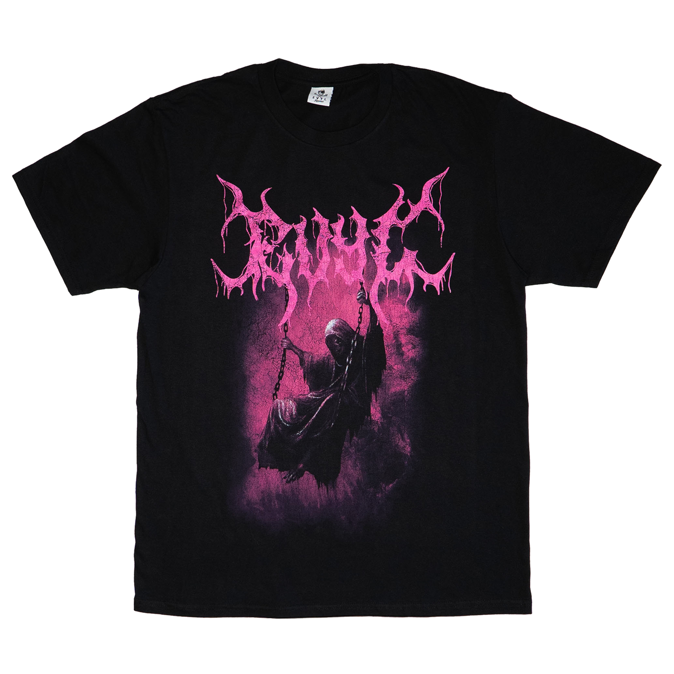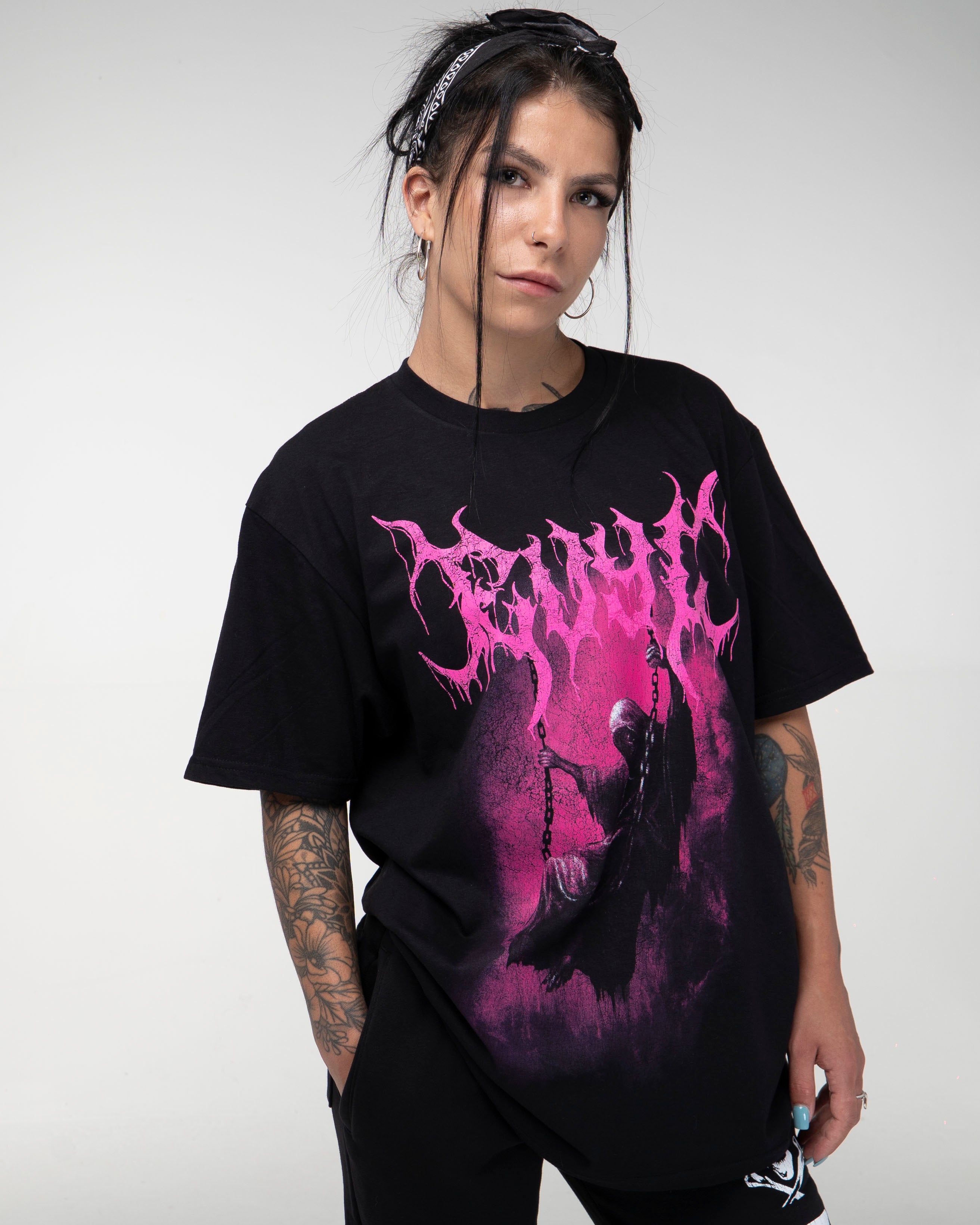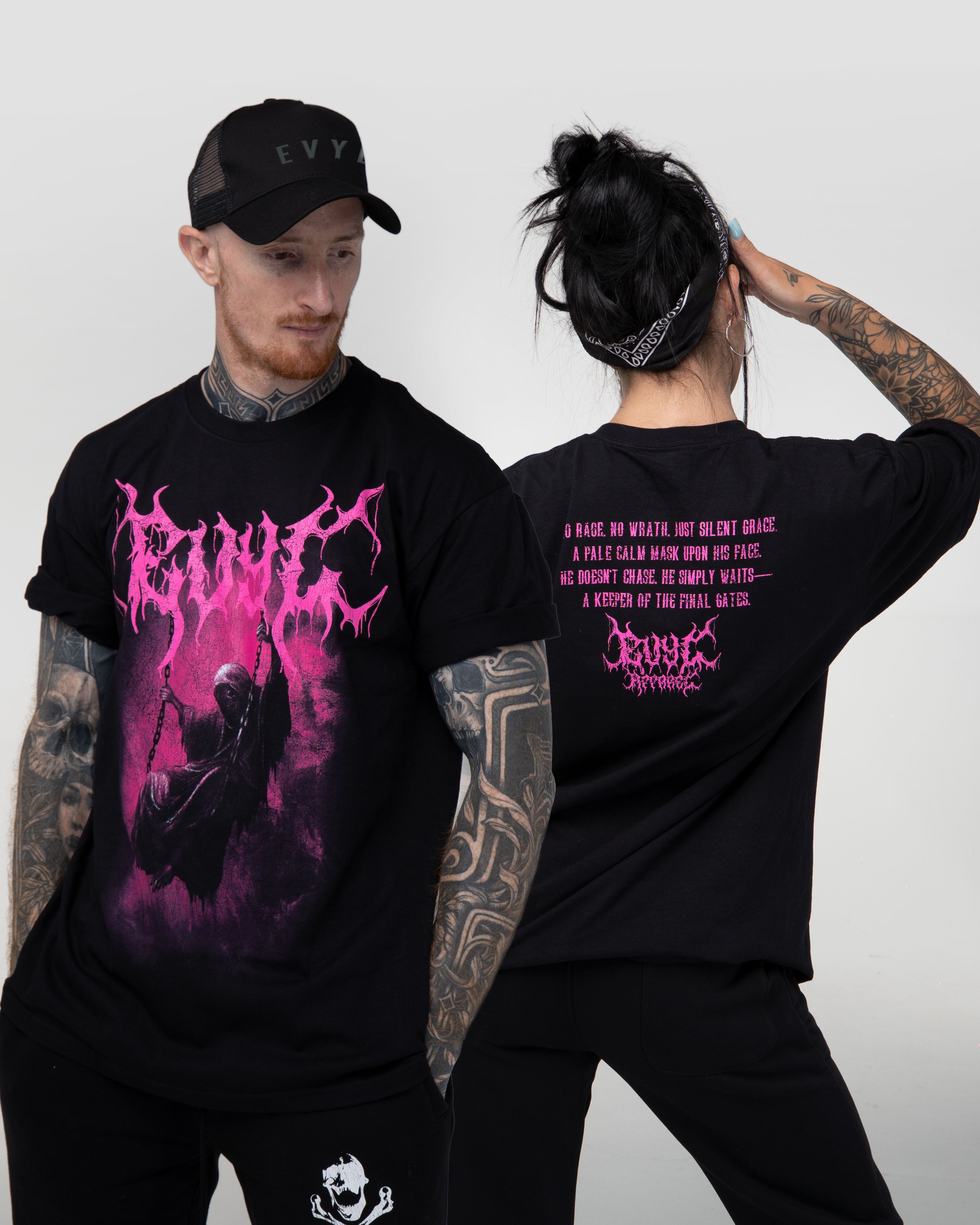 Grimreaper design, full detail as a 5 colour front print. Original drawing was produced with Wax Based Coloured Pencil, Gouache and Carbon on Heavyweight Smooth 230gsm Paper.