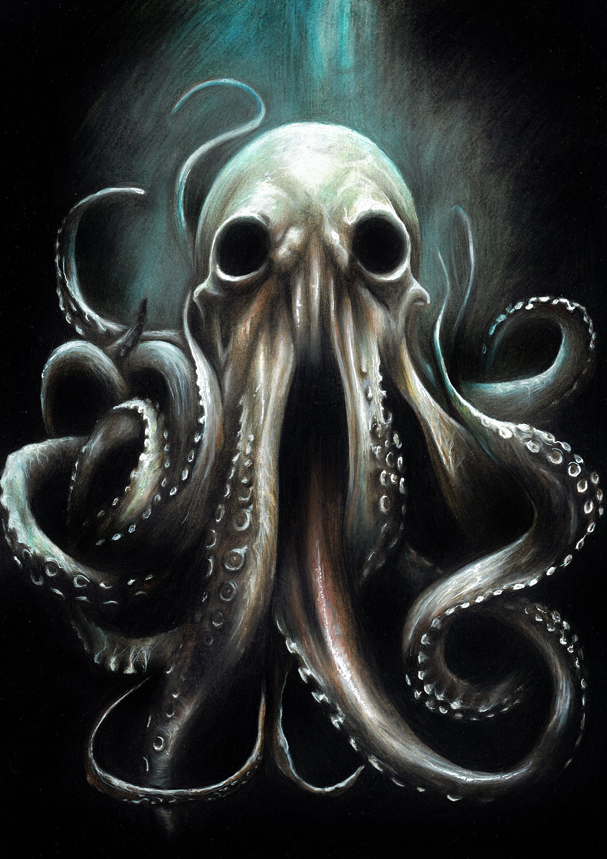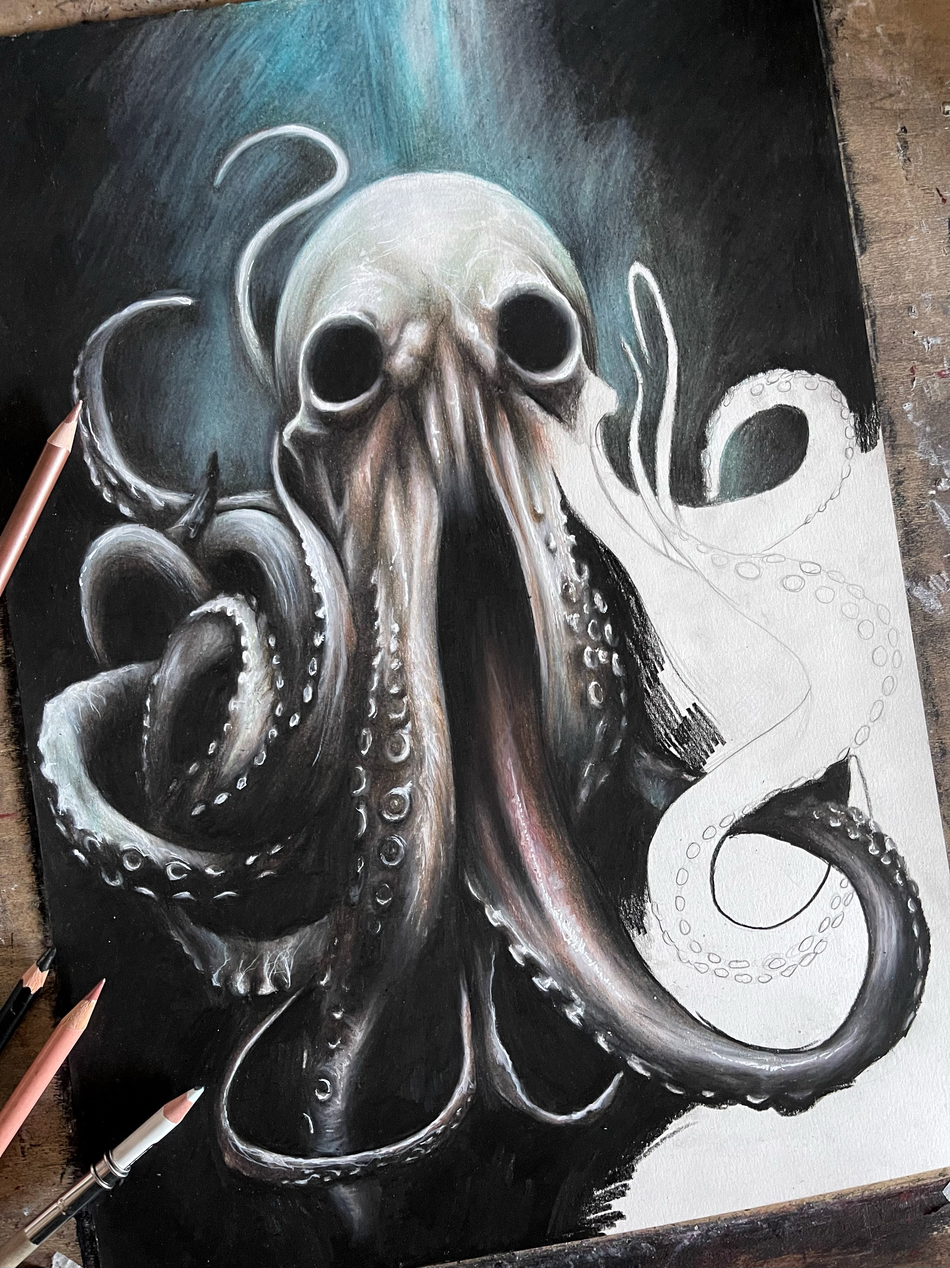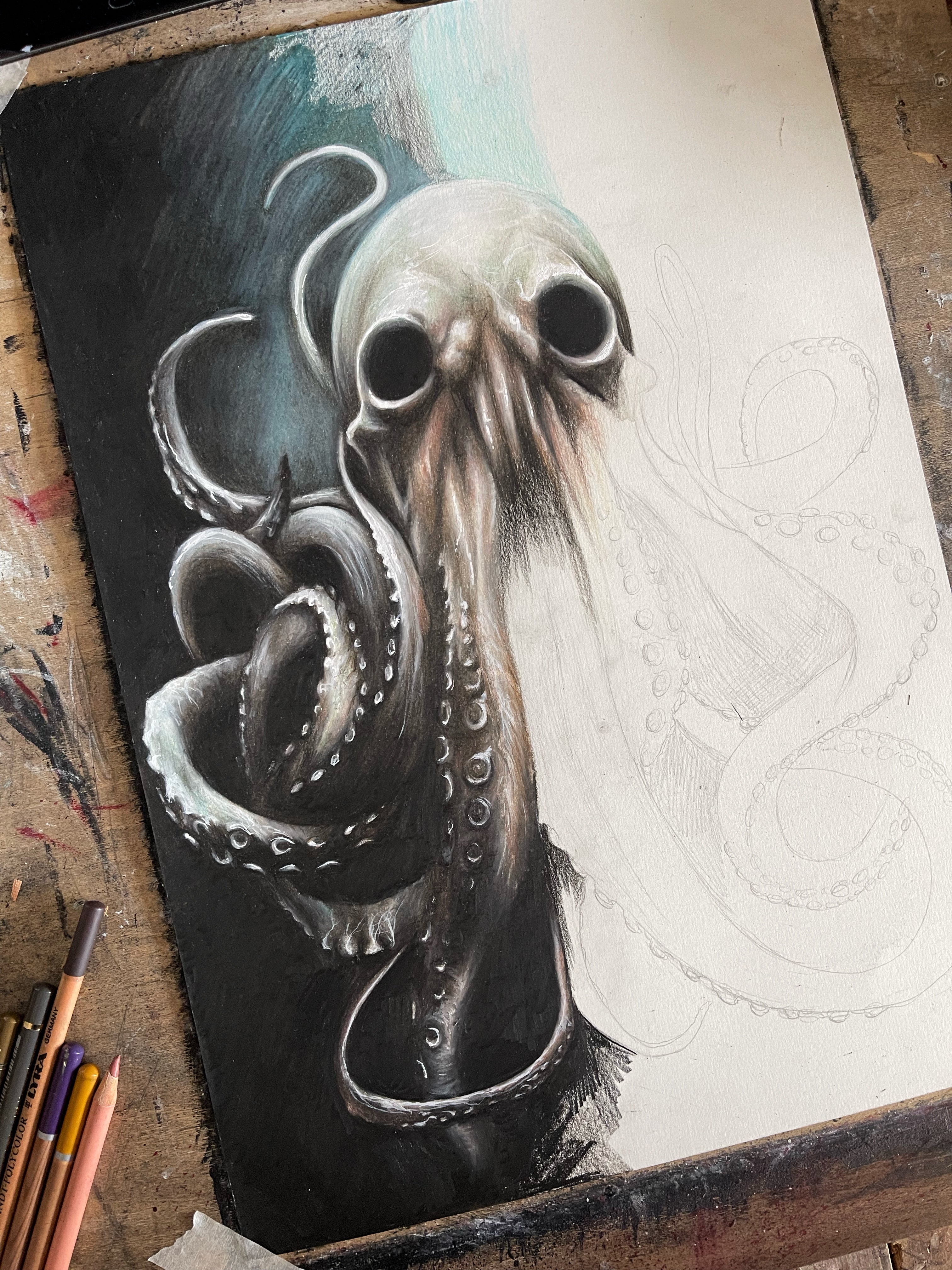 Octopus design inspired by mythical sea creatures. Original drawing was produced with Wax Based Coloured Pencil, Gouache and Carbon on Heavyweight Smooth 230gsm Paper.